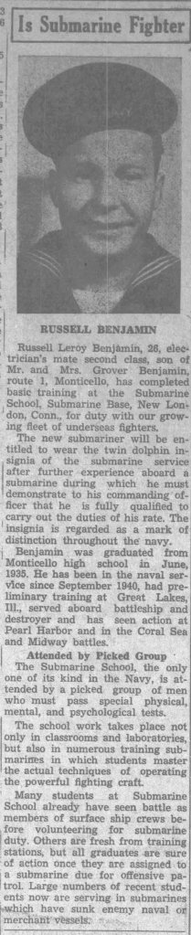 The headline called him a submarine fighter. The ink was grainy and the halftone blurred his face a little, but the pride was sharp enough to cut steel. Russell Leroy Benjamin, electrician’s mate, second class, son of Grover and Verda Benjamin of Route 1. A Monticello boy who had already seen Pearl Harbor, Coral Sea, Midway. Now he was headed to the Submarine School in New London, Connecticut, to join what the paper called “our growing fleet of underseas fighters.”