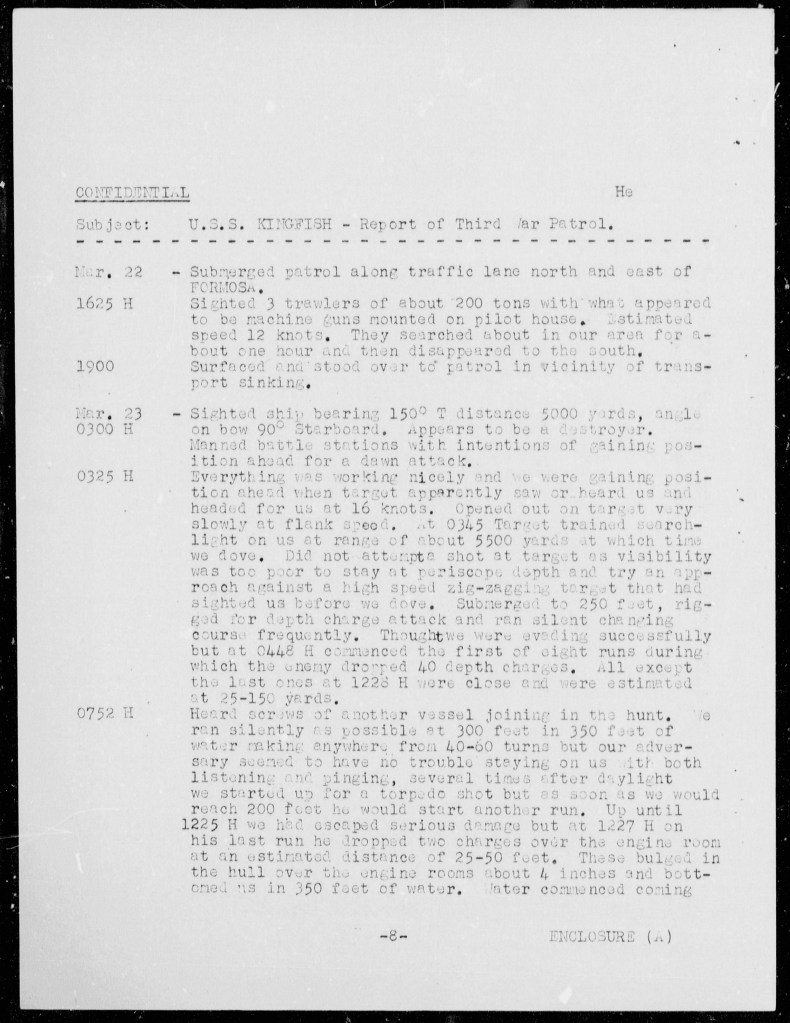 The incredibly understated deck log from the USS Kingfish SS-234 for March 23, 1943 (National Archives)