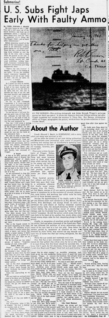 What makes Submarine! unique is its blend of firsthand memoir and composite storytelling. Rather than write strictly about his own missions, Beach gathers real-life experiences from several submarines—Trigger, Wahoo, Harder, Tang, and others—blending them into a chronological, unified narrative of the Pacific submarine campaign. The result is a thrilling, authentic, and highly readable account of a silent war fought beneath the waves.