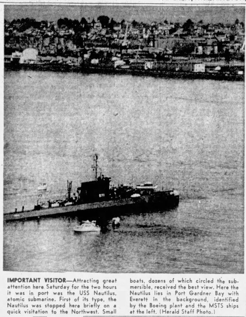 Anchored in Everett harbor for just two hours, Nautilus made no docking, no public tours, and extended no gangway. But her mere presence in Port Gardner Bay was enough to draw hundreds of onlookers. Local radio station KRKO had hyped the visit beforehand, and residents from all over Snohomish County flocked to the shoreline to catch a glimpse.