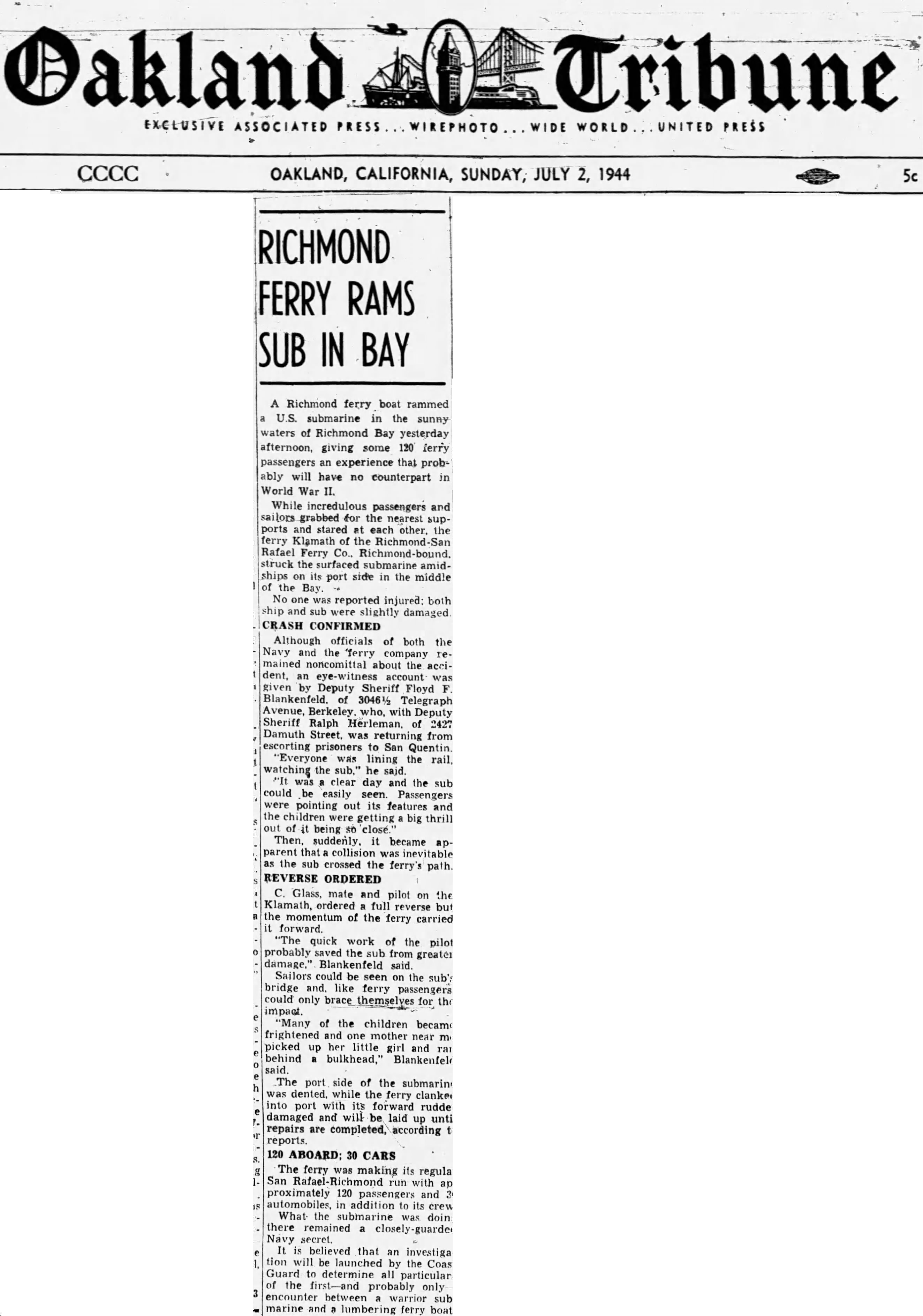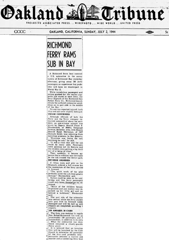 The incident made headlines across the Bay. The Oakland Tribune quipped that it might be the first, and probably only, encounter between a warrior submarine and a lumbering ferryboat. The Navy, for its part, remained mum on the details. Was it wartime secrecy or sheer embarrassment? We’ll let the reader decide.