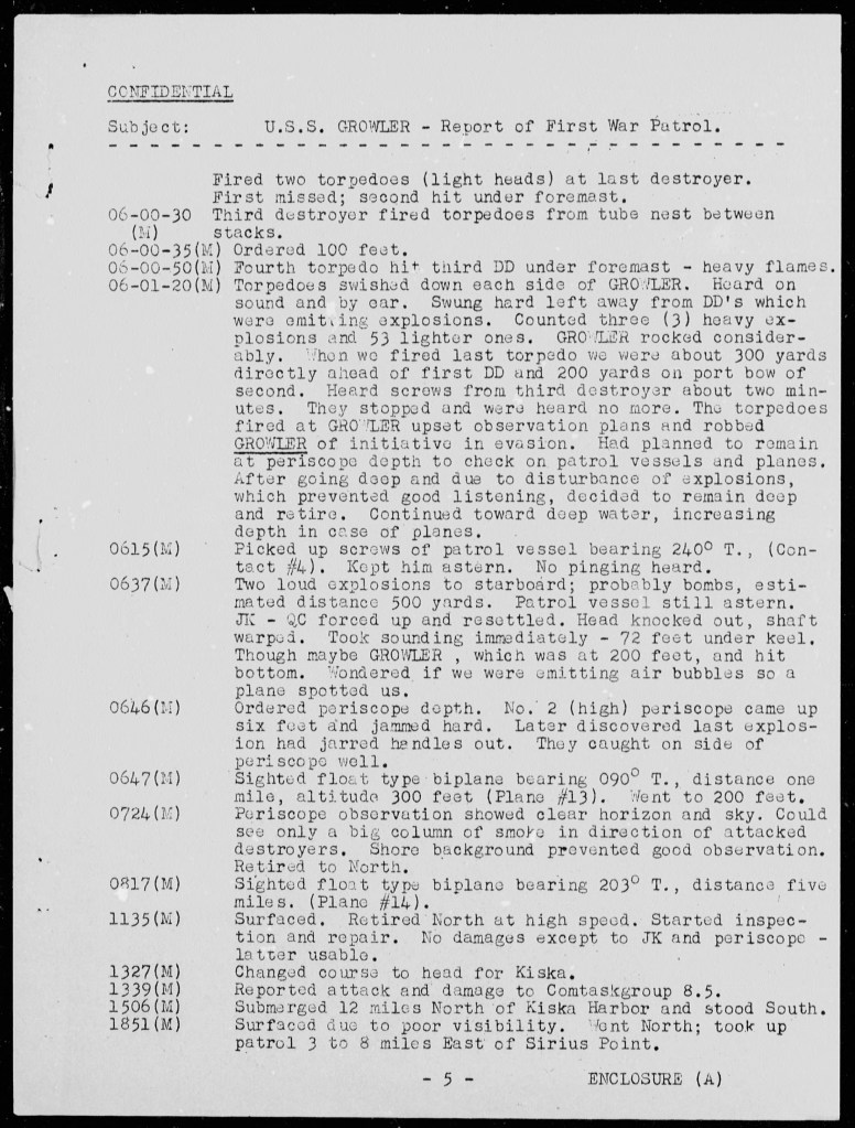 That afternoon, Growler turned her course back toward Kiska. She had struck hard and gotten away, but the risk had been immense. Later reports would confirm the results, enemy destroyers heavily damaged or destroyed. The Aleutian campaign was still young, and the Japanese were not going to let go of Kiska easily. But Growler’s July 5 action proved that even in the cold waters off a distant island, the steel resolve of a U.S. submarine and her crew could strike fear and confusion deep into the heart of the Imperial Navy.
