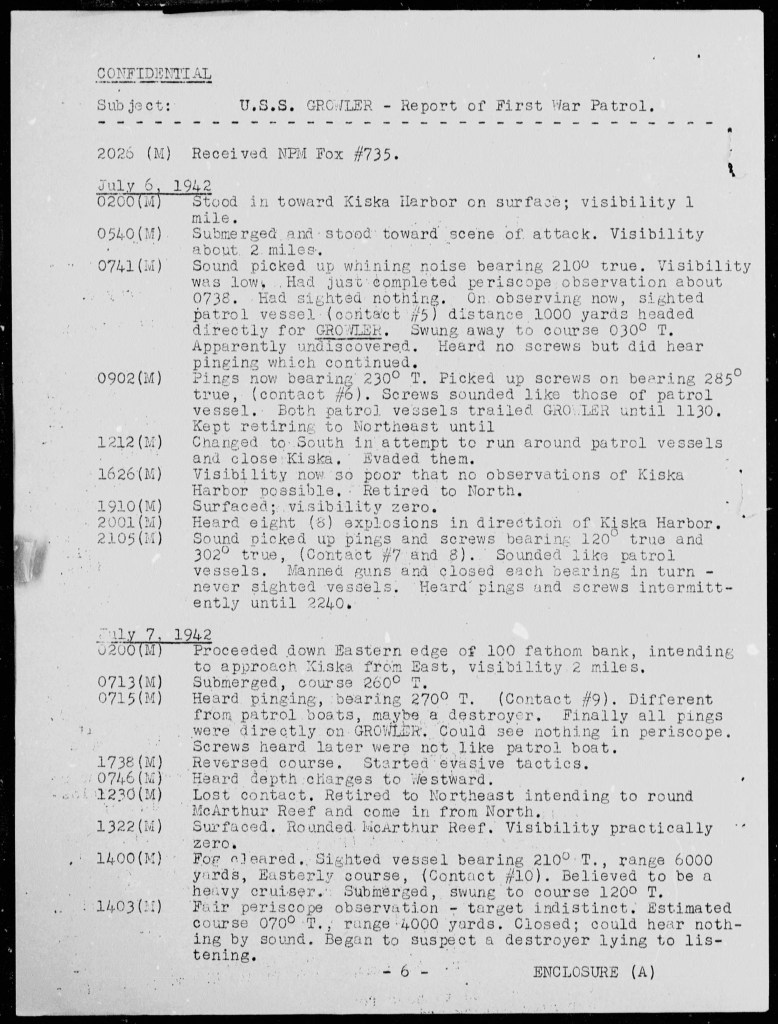 For the men aboard Growler, the day began as it often did on patrol. Visibility had improved since the previous night, and the morning hours were spent submerged, listening. At 0413 hours, at a quiet periscope depth, the boat’s sonar picked up a formation of enemy ships. The contact was sharp and clear—three vessels bearing 240 degrees true, estimated at 8000 yards and closing. The estimated course of the targets was 090 to 110 degrees true. Their size and profile suggested something more serious than patrol boats. It looked like cruisers leaving Kiska.