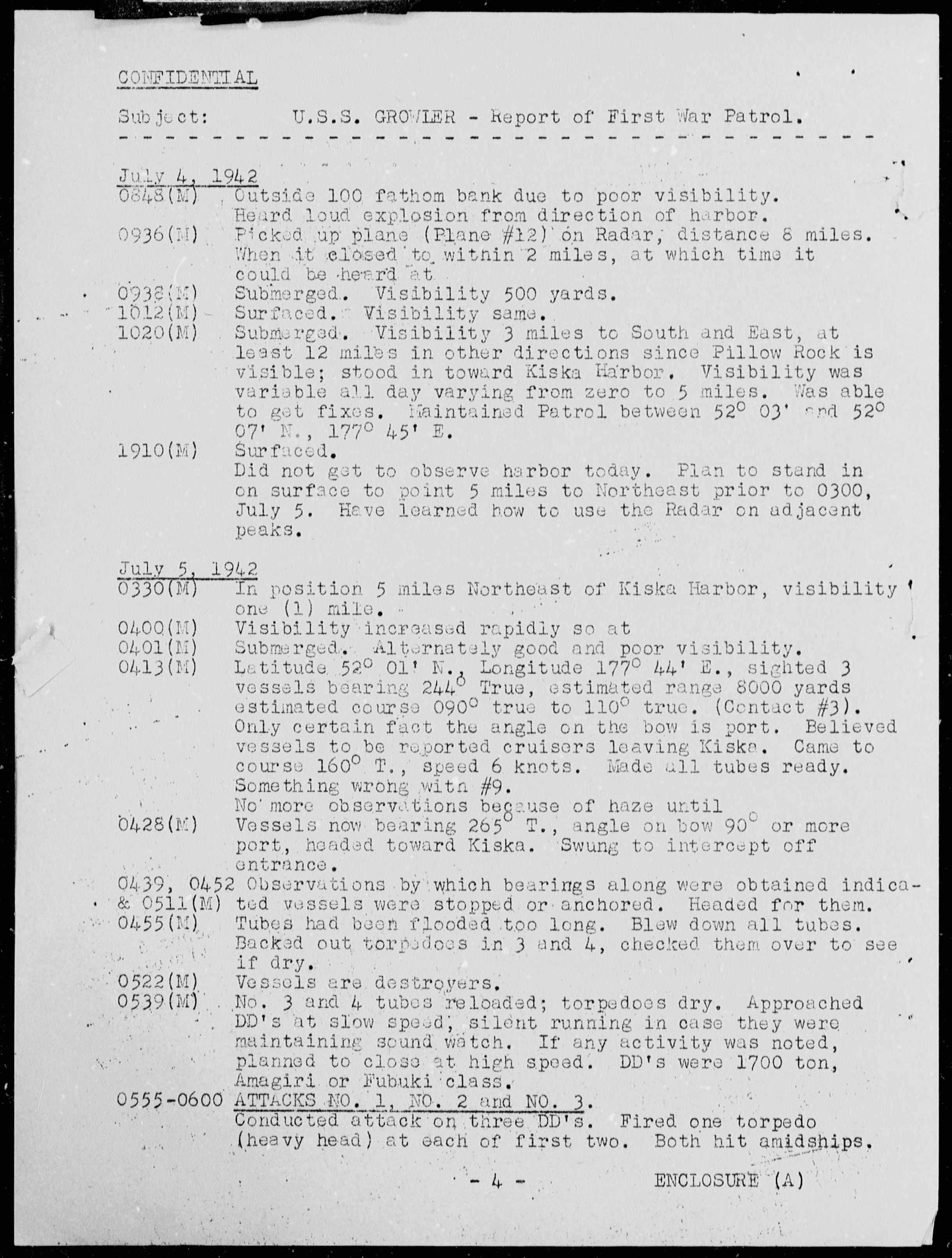 For the men aboard Growler, the day began as it often did on patrol. Visibility had improved since the previous night, and the morning hours were spent submerged, listening. At 0413 hours, at a quiet periscope depth, the boat’s sonar picked up a formation of enemy ships. The contact was sharp and clear—three vessels bearing 240 degrees true, estimated at 8000 yards and closing. The estimated course of the targets was 090 to 110 degrees true. Their size and profile suggested something more serious than patrol boats. It looked like cruisers leaving Kiska.