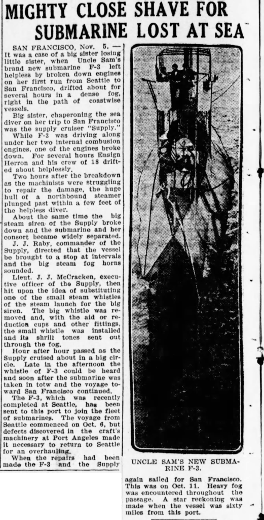 Reassigned to the Coast Torpedo Force at San Pedro, California, F-3 became a workhorse. She trained students from the newly formed submarine school, running daily operations both above and below the waves. It was during one of these exercises, on December 17, 1917, that tragedy struck.