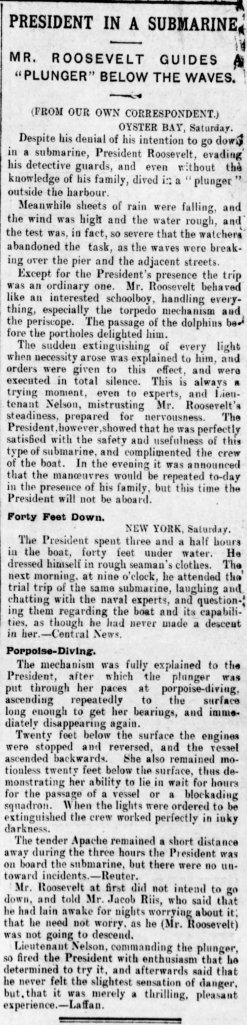 Then came the moment that put her on the front page. In August 1905, Theodore Roosevelt, the sitting President of the United States, climbed aboard Plunger off Oyster Bay and took her down for a dive. Roosevelt was not one to shrink from adventure. He had already ridden with the Rough Riders, charged up San Juan Hill, and hunted in the Dakotas. When he heard about these strange little submarines, he wanted to see one for himself. The Navy arranged for him to embark on Plunger, and with photographers on hand, Roosevelt descended beneath the surface of Long Island Sound. He was the first American President to dive in a submarine, and his presence aboard was a deliberate signal to the public and to Congress. If the Commander in Chief thought submarines were worth his time, then funding them was no longer in question. Roosevelt came back from the dive enthusiastic, declaring that the submarine would be a weapon of the future. Overnight, the perception of these craft shifted. What had been novelties suddenly had the President’s endorsement.