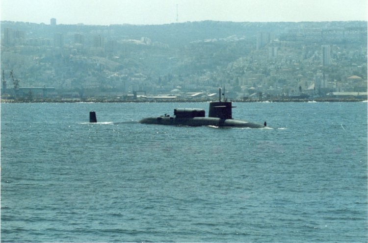 USS John Marshall SSN-611 with Dry deck Shelter, at Haifa, Israel, 1980 (NAVSOURCE)