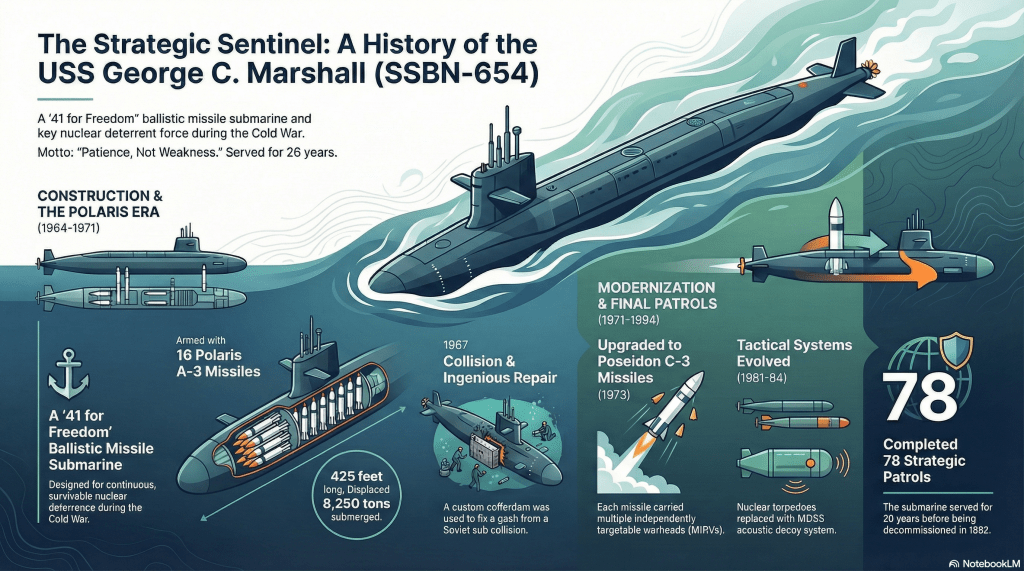 Commissioned in 1966, the USS George C. Marshall (SSBN-654) was a Benjamin Franklin class fleet ballistic missile submarine and part of the Navy’s most consequential experiment in quiet power, the forty one boats collectively known as the “41 for Freedom.” Their mission was brutally simple. Stay hidden. Stay ready. Make sure no rational enemy ever believed a first strike could succeed.
