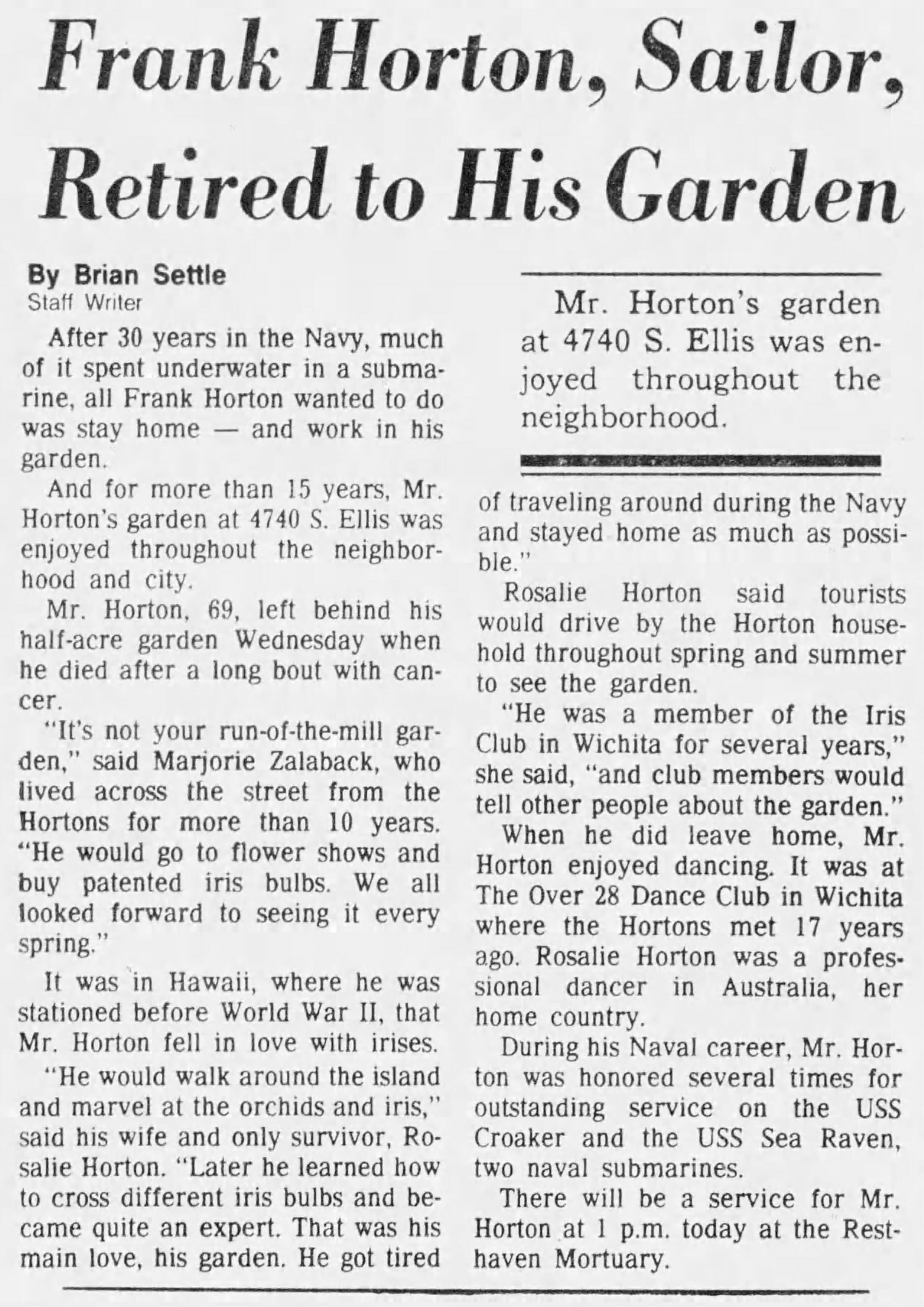 After more than thirty years in the Navy, much of it spent underwater, Frank Horton retired. He did not seek the ocean in his leisure. He sought soil. At 4740 South Ellis in Wichita, he built a garden that became quietly famous in the neighborhood and beyond. Tourists would drive by in spring and summer to see it. Club members would talk about it. Neighbors would wait for the irises to bloom.