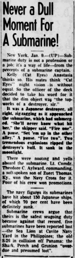Months later, the Hanford Morning Journal would present the story as a reassurance. It would explain that submarine duty was a way of life, that Cat Eyes Anastasia’s vision was without equal, that the skipper had said the destroyer would never know what hit her. It would note that Aylward, a soft spoken son of Zuert Thomas, Kentucky, received the Navy Cross, and that four of his crew earned promotions. It would even include statistics, about Japanese ships hit and sunk, and then quietly list the American submarines already lost, Sea Lion at Cavite, S 26, Shark, Perch, Grunion. It would try to balance pride with honesty.